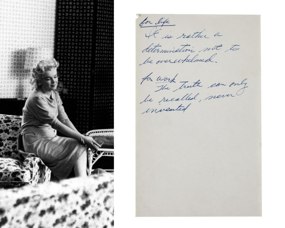 “An undated note on a single sheet of unlined paper, entirely in Monroe’s hand, reading ‘For life/ It is rather a determination not to be overwhelmed./ For work/ The truth can only be recalled, never invented.'”