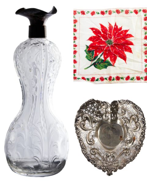 - Bottom right: “A sterling silver Gorham brand reticulated heart dish with scrolling bows and ribbons.” – SOLD for $2,880