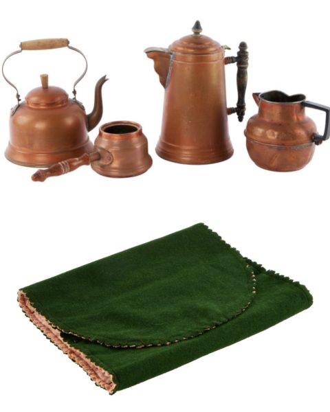 - Top: “A group of four vintage copper hollowware items, including a coffeepot with a wood handle marked ‘Majestic,’ a teapot marked ‘Old Dutch,’ an unmarked pitcher, and a pot marked ‘Bazar Francais.'” – SOLD for $4,480
