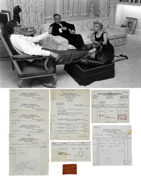 - “Four Marilyn Monroe receipts from Martindale’s Book Stores with dates in 1960 [probably during filming of Let’s Make Love.] Titles of various books purchased include, Color of Evening, How to Live with a Cat, My Father Charlie Chaplin, and Vogue among others. [Marilyn had briefly dated Charlie Chaplin Jr. in the 1940s, as mentioned in his memoir. His rather terse account was markedly different from the heavily fictionalised version of their relationship depicted in Joyce Carol Oates’ novel, Blonde, and the recent Netflix adaptation.] – SOLD for $1,024