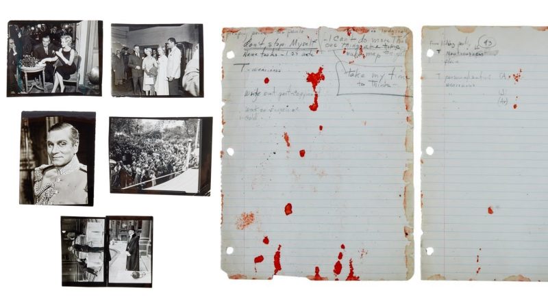 - “Two pages torn from a lined spiral-bound notebook, both stained in red ink. The first page contains references to ‘The Sleeping Prince,’ an early production title for The Prince and the Showgirl, dating these writings to 1956. The notes show Monroe becoming her own task master, reminding herself ‘don’t stop myself,’ ‘learn – lines logically,’ ‘I can’t do more than/ one thing at a time/ make map tonight,’ and ‘take my time to think.’ She instructs herself to make a list of tasks and work on exercises, which perhaps explains the cryptic writings on the second page, reading in full, ‘From Ridding partly/ T Nautiousness [sic]/ Place/ personalization (A)/ weariness/ (J)/ (Ar).'” – SOLD for $3,520