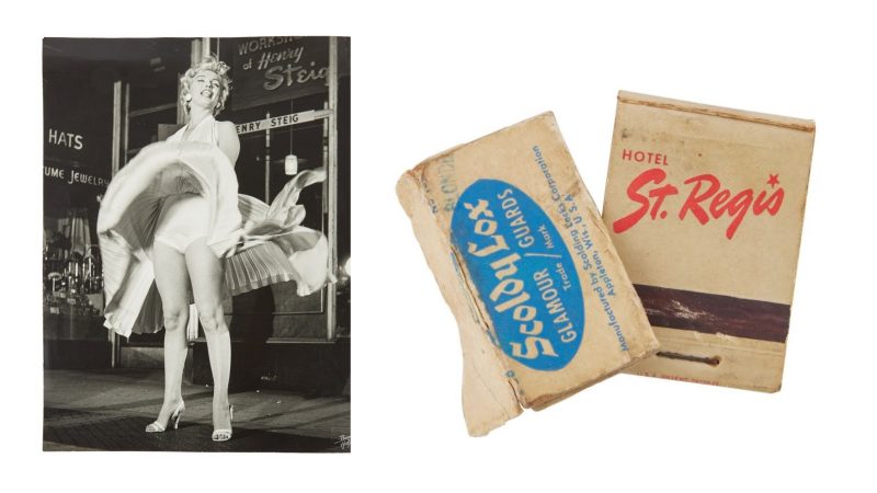 - “A partial cardboard box printed with the words ‘Scoldy Lox / Glamour Guards’ and stamped with the word ‘Blonde’ once contained hair pins and belonged to Marilyn Monroe. Together with a matchbook from the Hotel St. Regis in New York [where Marilyn stayed while filming the ‘subway scene’ in September 1954.]” – SOLD for $1,600