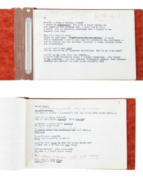 “A small bound group of 31 mimeographed half pages containing Monroe’s dialogue for Bus Stop. Ten of the pages contain notes in Monroe’s hand in pencil. Additional notes in the hand of Paula Strasberg and an administrative hand. A note in Monroe’s hand on the first page next to lines about her character Cherie wanting to be respected and tired of being ‘pawed at and pinched at’ reads ‘Fight with manager/ A.M. H. Cohn middle of dinner party’ clearly references incidents Monroe wished to draw upon from her life in the scene [including studio boss Harry Cohn’s unwanted advances during her 1948 stint at Columbia.] Another note in Monroe’s hand written beneath the line ‘Oh – it’s you!’ reads ‘(Good God it’s you).'”