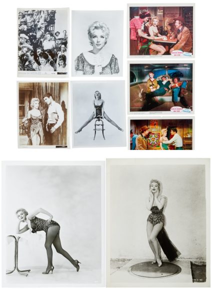 - At top: “A group of seven vintage studio images of Marilyn Monroe from the film Bus Stop (1956). Includes three colour publicity photographs stamped ‘Theatre Poster Exchange’ on verso and four black and white studio images from the film, including one taken by Milton Greene.” – SOLD for $640