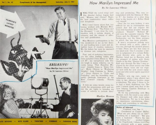 “An issue of Florida’s Playtime Magazine dated July 6, 1957 featuring a photo of Marilyn Monroe and Laurence Oliver on the cover was personally owned by Monroe. Copy on the cover reads ‘EXCLUSIVE! / How Marilyn Impressed Me / By Sir Laurence Olivier.’ On page 6 is the article in which Olivier details his experience directing and acting alongside Monroe when the two made the film The Prince and the Showgirl and reads in part: ‘For me it has been an experience, entertaining, stimulating and rewarding in extreme.'”