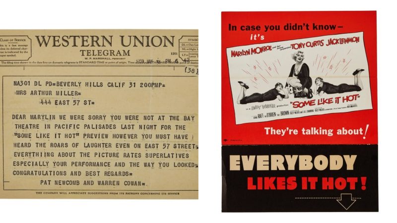 - “A telegram dated January 31, 1959, from publicists Pat Newcomb and Warren Cowan. The telegram reads in part, ‘You must have heard the roars of laughter even on East 57th Street. Everything about the picture rates superlatives, especially your performance and the way you looked.’ The telegram was sent after the senders had seen a preview of Monroe’s latest film, Some Like it Hot.” – SOLD for $1,280