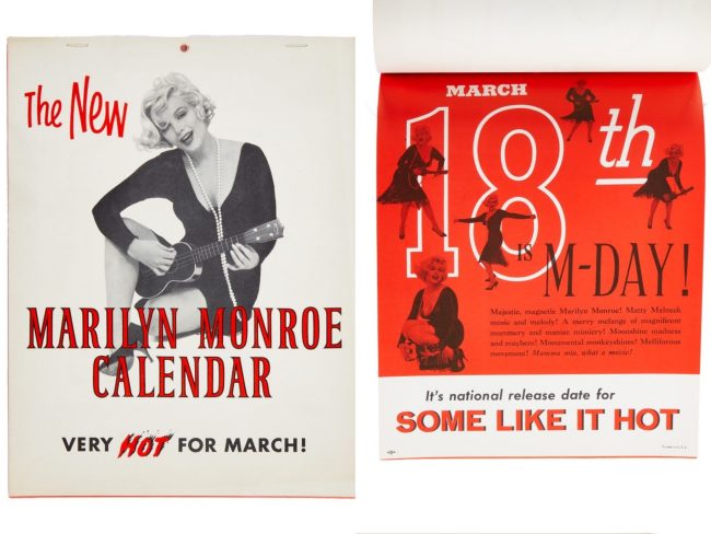 “A release date calendar for Some Like It Hot (1959), personally owned by Marilyn Monroe. The cover page, featuring a photo of Marilyn in costume playing a ukulele reads: ‘The New Marilyn Monroe Calendar, Very Hot For March,’ an allusion to the famous 1951 nude calendar which helped establish Monroe as the premiere sex symbol of her era. The calendar features four pages, each with a photo of Monroe and announcing March 18 as the comedy’s release date. The back page features the film’s poster.”
