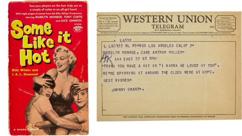 - Marilyn’s personally owned paperback edition of the screenplay for Some Like It Hot (Signet Books, 1959) by Billy Wilder and I. A. L. Diamond, featuring eight pages of photographs from the film.” – SOLD for $1,600