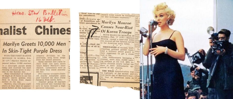 “A pair of clippings from the Honolulu Star Bulletin reporting on Marilyn Monroe’s 1954 visit to Korea and her performance for the U.S. troops were personally owned by the actress. The headlines read: ‘Marilyn Greets 10,000 Men In Skin-Tight Purple Dress’ and ‘Marilyn Monroe Causes Near-Riot Of Korea Troops.'”