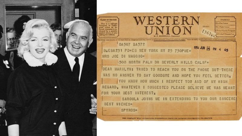 “A telegram addressed to Mrs. Joe DiMaggio dated June 25, 1954 from Spyros P. Skouras, president of 20th Century Fox from 1942 to 1962. The telegram reads in part, ‘You know. How much I respect you and of my high regard, whatever I suggested please believe me was meant for your best interest.’ [Marilyn was preparing to film There’s No Business Like Show Business at the time, and a contractual dispute was brewing.]