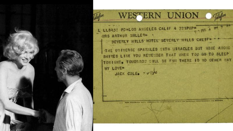 “A telegram from choreographer Jack Cole, dated February 4, 1960. The telegram is addressed to Monroe at the Beverly Hills Hotel, and reads, ‘The universe sparkles with miracles but none among them shines like you. Remember that when you go to sleep tonight. Tomorrow will be fun. There is no other way. All my love, Jack Cole.’ This telegram was likely sent the day before they started working together on Let’s Make Love.”
