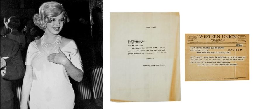“An April 14, 1959 telegram to the star advising that a beige dress had been located and sent to Monroe, after a stay at the Ambassador East Hotel. Also included, a carbon copy response of a letter of appreciation sent to Dan Sullivan, the hotel’s assistant manager, with a signature line for Monroe’s secretary. [This probably refers to the dress Marilyn wore to a ladies’ luncheon while promoting Some Like It Hot in Chicago.]”