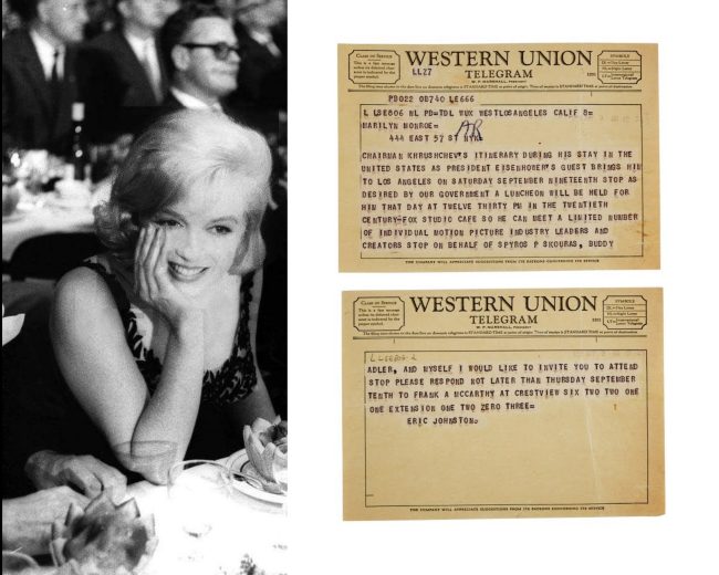 “A September 9, 1959, telegram to Marilyn Monroe advising of details of a luncheon at the 20th Century-Fox studio café in honor of Nikita Khrushchev, President of the Soviet Union. The message reads, in part, ‘Chairman Khrushchev’s itinerary during his stay in the United States as President Eisenhower’s guest brings him to Los Angeles on Saturday September nineteenth. Stop. As desired by our government a luncheon will be held for him that day at twelve thirty PM.’ Page two reads, ‘I would like to invite you to attend.’ The telegram is from Eric Johnston, head of the U.S. Chamber of Commerce, President of the Motion Picture Association of America, and an appointed official in the Truman and Eisenhower administrations.”