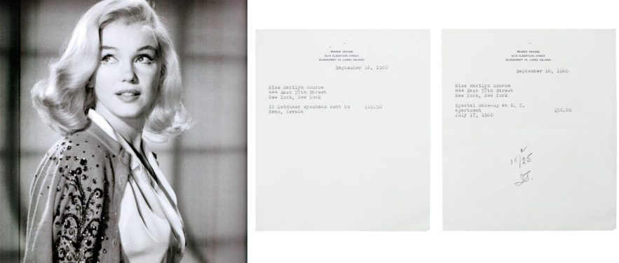 “Two invoices from makeup artist Marie Irvine. Both invoices are dated September 16, 1960. One reads ‘Special make-up at N.Y. apartment, July 17, 1960;’ the other reads ’12 Leichner eyeshade [sic]’ sent to Reno, Nevada. [This may refer to Irvine’s services during hair, make-up and wardrobe tests for The Misfits.]”