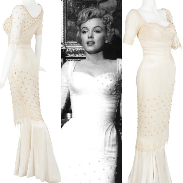 - Pearl-grey silk halter dress by Jax, worn at 1960 press party for Let’s Make Love ($224,000)