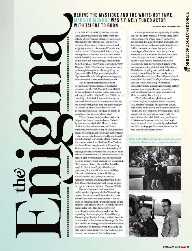 Marilyn has been voted one of the 50 Greatest Actors of All Time in a readers’ poll for UK movie magazine Empire‘s latest issue (dated February 2023, with Nicolas Cage on the cover.) Inside there’s a tribute from critic Christina Newland, with a special focus on Marilyn’s performance in The Misfits – and her former co-stars Bette Davis (All About Eve) and Laurence Olivier (The Prince and the Showgirl) also made the list.