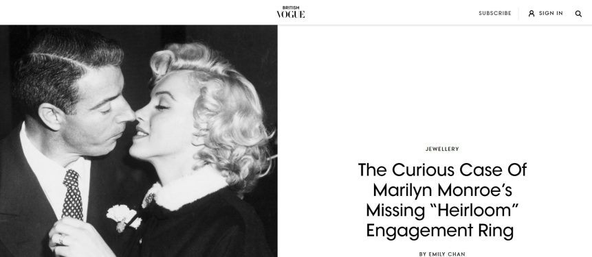 Writing for Vogue, Emily Chan ponders the riddle of Marilyn’s engagement ring from Joe DiMaggio. (You can also read a more detailed account via the Marilyn Monroe Collection blog.)