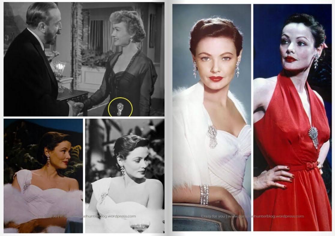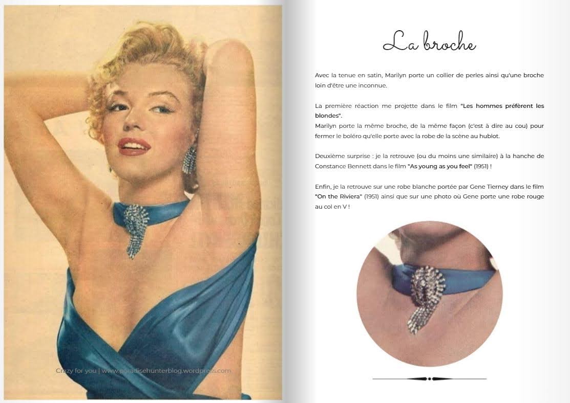 Another interesting detail is the brooch on Marilyn’s blue satin gown, later used again on another costume for Gentlemen Prefer Blondes. The same brooch – or a very similar one – was seen on the waistline of Constance Bennett’s costume for As Young as You Feel (1951), in which Marilyn also played a small part. Furthermore, Gene Tierney also appears to have worn the brooch in another 1951 movie, On the Riviera, and for a publicity photo from the same era.