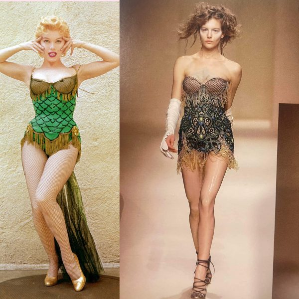 Marilyn’s influence can also be perceived in some of Westwood’s later designs. This mini-dress, from her Spring/Summer Ready to Wear collection, was likely inspired by the ‘snake costume’ designed by Travilla, and worn by Marilyn for her role as showgirl Cherie in Bus Stop (1956.) And like Cherie’s fishnet stockings, the model’s tights appear to be laddered!
