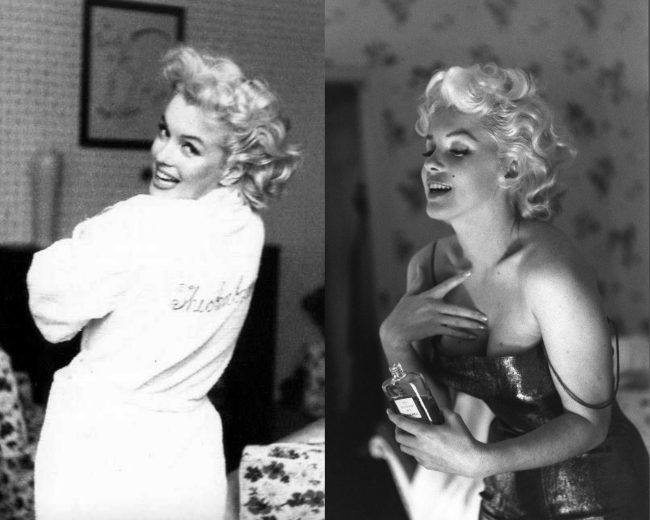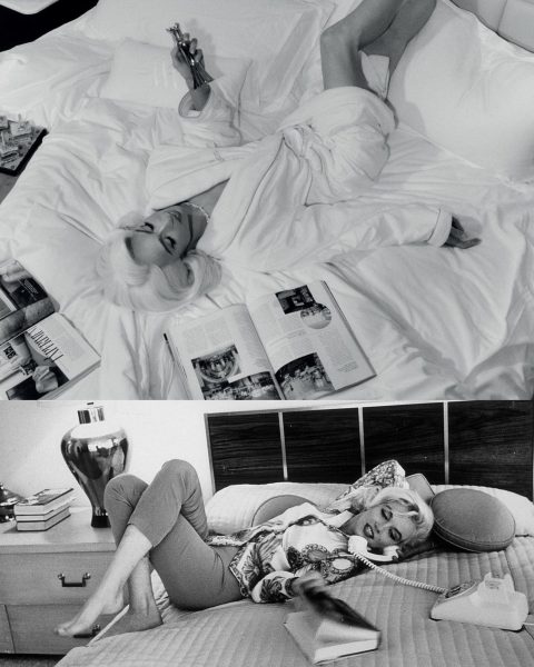 The hotel setting of this layout – in which, clad in a white bathrobe with a necklace and a dab of her new fragrance, Ruby Rush, Paris makes a phonecall – echo classic images of Marilyn by Ed Feingersh (see above), with other photos possibly referencing one of her last sittings with George Barris (below).