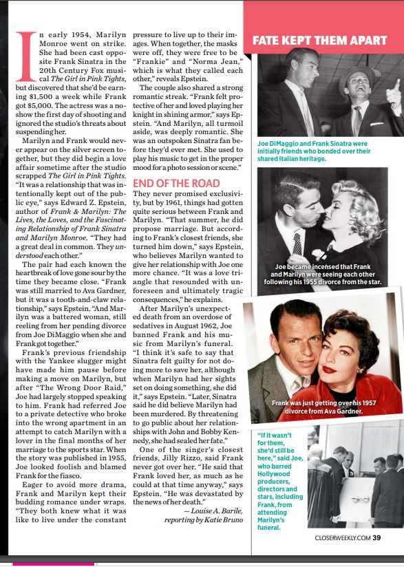 The latest issue of Closer Weekly USA (dated February 20, 2023) includes a two-page article about Edward Z. Epstein’s new book, Frank & Marilyn, about her relationship with Frank Sinatra.