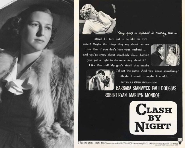 Of the three, Parsons was most to the manor born, the daughter of famed gossip columnist Louella Parsons … For Clash by Night, Parsons worked with the producing team of Jerry Wald and Norman Krasna, who assigned her the responsibility of supervising daily progress.