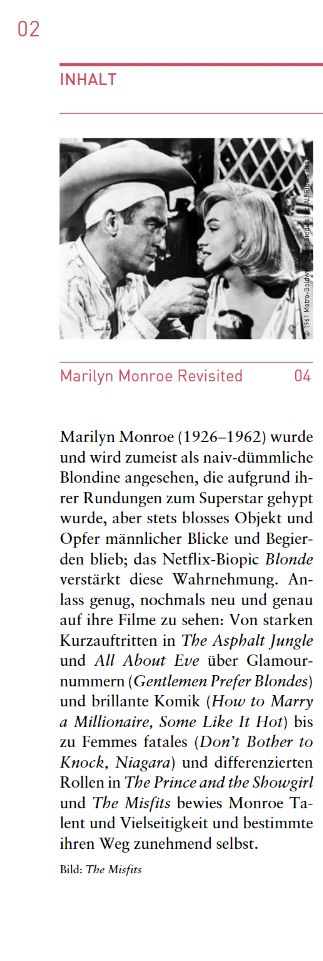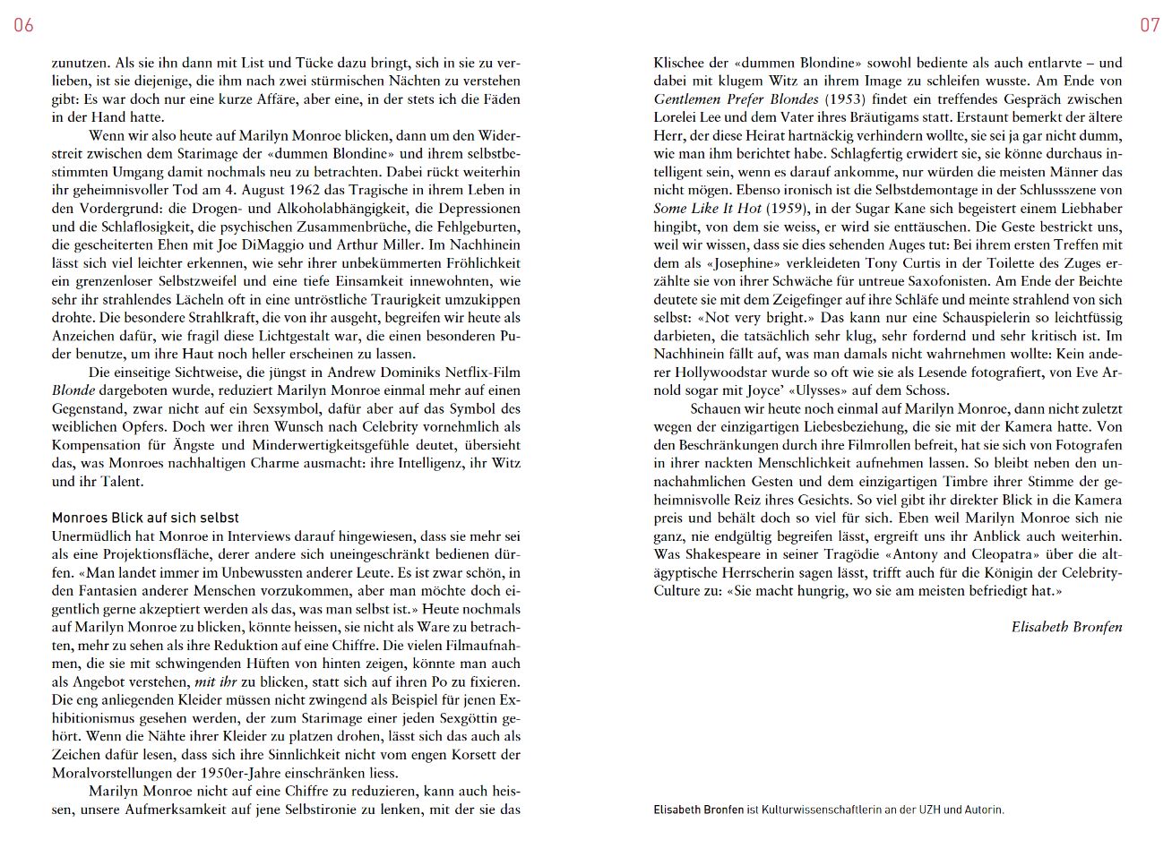 So when we look at Marilyn Monroe today, it’s to reconsider the conflict between the star image of the ‘dumb blonde’ and her self-determined handling of it. Her mysterious death on August 4, 1962 continues to bring the tragedy of her life to the fore: drug and alcohol addiction, depression and insomnia, mental breakdowns, miscarriages, failed marriages with Joe DiMaggio and Arthur Miller. In hindsight, it is much easier to see how boundless self-doubt and deep loneliness were inherent in her carefree happiness, how much her radiant smile often threatened to tip over into inconsolable sadness … But anyone who interprets her desire for celebrity primarily as compensation for fears and feelings of inferiority overlooks what constitutes Monroe’s enduring charm: her intelligence, her wit and her talent.”