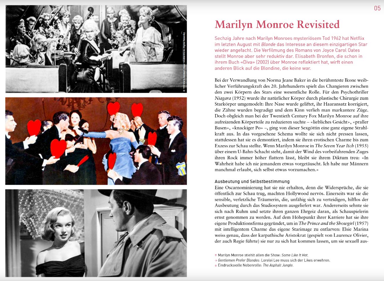 “Monroe has tirelessly pointed out in interviews that she is more than a projection screen that others are free to use. ‘You’re always running into people’s unconscious. It’s nice to be included in people’s fantasies, but you also like to be accepted for your own sake..’ Looking again at Marilyn Monroe today could mean not seeing her as a commodity, seeing her more as her reduction to a cypher. The many film shots that show her from behind with swinging hips could also be understood as an offer to be with her … The tight-fitting dresses do not necessarily have to be seen as an example of the exhibitionism that is part of the star image of every sex goddess. When the seams of her clothes threaten to burst, this can also be read as a sign that her sensuality did not allow herself to be restricted by the tight corset of the moral concepts of the 1950s.