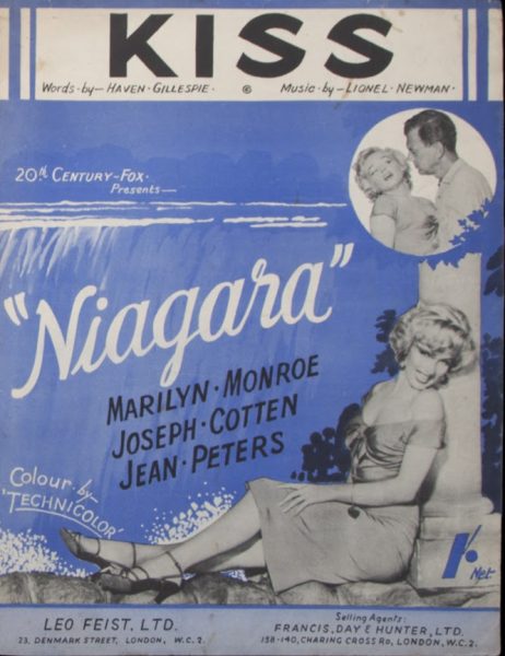 Niagara is showing at the Filmhuis Den Haag on Saturday, April 8th, and on selected dates through to May 7th, as part of a season celebrating classic movie soundtracks, accompanying an exhibition, ‘The Sound of Cinema‘. The 1953 film noir’s score was composed by Sol Kaplan, and conducted by Lionel Newman. (You can listen to the Niagara soundtrack here, while Marilyn’s own version of the theme song, ‘Kiss,’ was released separately.)