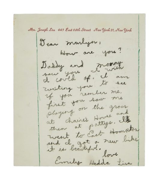 An undated handwritten fan letter to Marilyn Monroe from a young child, signed Emily Hedda Liss. The letterhead reads ‘Mrs. Joseph Liss, 445 East 68th Street, New York, New York,’ indicating Emily is likely the young daughter of television writer and editor Joseph Liss. The letter reads: ‘Dear Marilyn, How are you? Daddy and mommy saw you. I wish I could of. I am writing you to see if you rember (sic) me. First you saw me playing on the grass at Chaire’s house and then at Patty’s. I went to East Hampton and I got a new bike. It is beautiful.'” – SOLD for $195