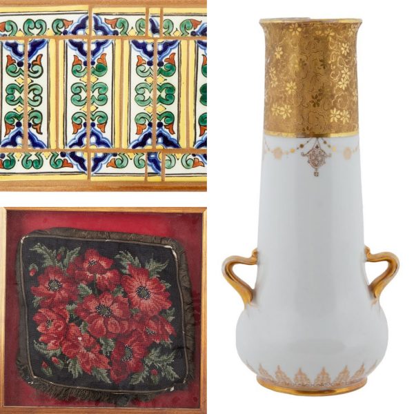 Top left: “A wooden plaque that was custom-made with surplus tile Marilyn Monroe personally chose for the kitchen and master bathroom of her final home located at 12305 5th Helena Drive in Los Angeles. The blue, green, yellow, and white patterned tiles were handpicked by Monroe to be installed in her home and are the last of the batch that remained following her death in August 1962. The plaque was custom made in the 1980s by request of the daughter of the late Dr. and Mrs. Gilbert Nunez, who purchased the home in 1963.” – SOLD for $4,550