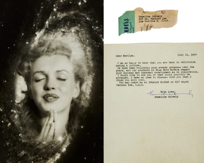 At right: “A one-page typed letter to Marilyn from Emmeline Snively, dated July 31, 1958. Snively was the owner and manager of the Bluebook Modeling Agency. Marilyn, still Norma Jeane at the time, signed with the agency in 1945 … Included with this letter is a torn portion of the original mailing envelope with Snively’s typed mailing address. Pencil scribbles are visible on the envelope fragment, possibly written in Marilyn’s own hand. It is interesting to note that Snively attempted to stay in contact with Marilyn throughout the star’s career. In fact, she was one of a very few guests from Marilyn’s inner circle who was invited to her funeral.” – SOLD for $1,143
