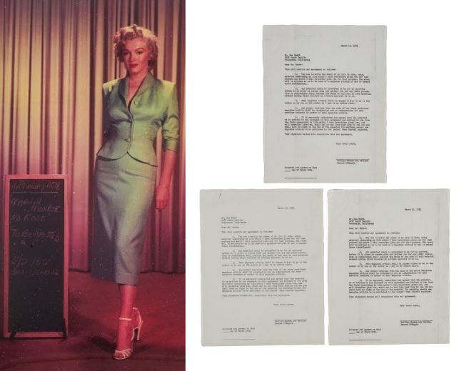 At right: “Six documents referencing an agreement, and the dissolution thereof, between Marilyn Monroe and Ben Hecht regarding his authoring her life story. Included is a facsimile copy of the originally signed agreement between Monroe and Hecht, dated March 16, 1954 … Also included is a facsimile copy of a two-page letter sent to Hecht by Marilyn’s attorney Lloyd Wright, Jr., in which he demands that Hecht ‘surrender to us on behalf of our client, Miss Marilyn Monroe, all, and I repeat all, copies of any material …’ Hecht partnered with Monroe to write her life story, which was to be published only in the Ladies’ Home Journal magazine.” – [Unbeknown to Hecht, his agent Jacques Chambrun sold the text without Marilyn’s knowledge or approval, and it was serialised in London’s Empire News from May through August 1954. It remained unpublished in the US until 1974, when it was released in book form as My Story.] – SOLD for $910