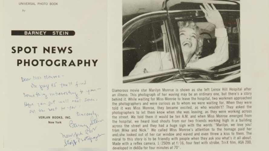 “A copy of Spot News Photography (Verlan Books, 1960) by Barney Stein that belonged to Marilyn. Stein was a New York Post staff photographer who mailed the book to Monroe and inscribed the first page with a handwritten note that reads in part: ‘Dear Miss Monroe / On page 95 you’ll find something interesting to you / Hope you get well real soon. / All the best to you.’ Stein had photographed Marilyn in 1959 as she departed Lenox Hill Hospital in New York [following surgery for endometriosis]. He had notified two men working across the street from the hospital about her departure and they yelled to her as she entered her car and held up a handmade sign that read ‘Marilyn, We love you! From mike and Nick.’ Monroe looked up, waved, and blew them a kiss.” – SOLD for $325