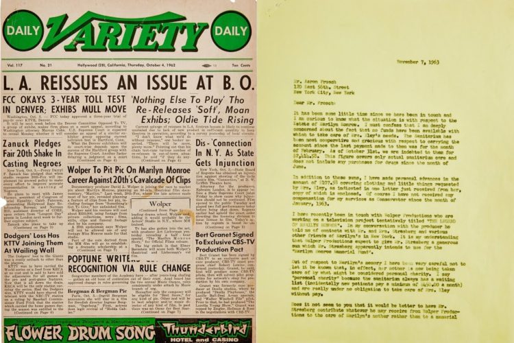 At left: “A front page of trade publication Variety dated October 4, 1962 that was owned by the Strasberg family. An article in the center of the page discusses the numerous documentary projects that were rushed into development to capitalize on the death of Marilyn Monroe the previous August. This article reads in part: ‘Documentary producer David L. Wolper is joining the race to market pix about Marilyn Monroe, planning an 80-min. theatrical film documentary, Marilyn.’ [It was released in 1966 as The Legend of Marilyn Monroe.] – SOLD for $76.50