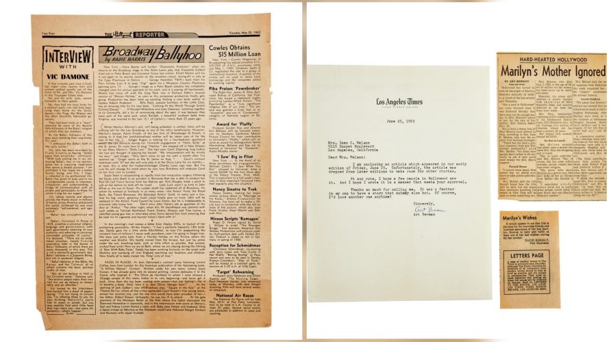At right: “A group of items related to Gladys Baker Eley, including an article from the June 25, 1965 edition of the Los Angeles Times, a typewritten letter from the author of the story on Los Angeles Times letterhead, and a published letter from a reader in response to the article. The article was published under the headline ‘Hard-Hearted Hollywood / Marilyn’s Mother Ignored’ and features quotes from Mrs. Inez Melson, Monroe’s business manager, regarding how none of Monroe’s close friends had offered to help pay for Eley’s care but several of Monroe’s fans had offered to send money for her support. The Times writer sent the clipping and a letter to Melson to confirm she’d seen it.” – SOLD for $260