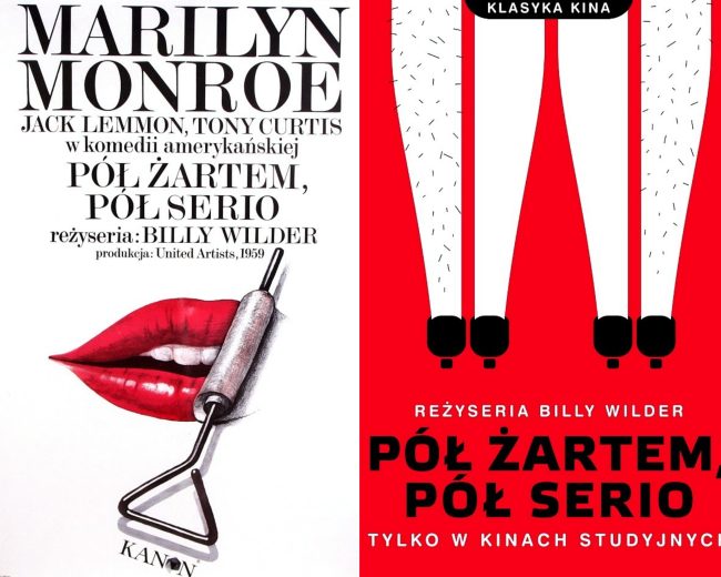 The film’s Polish title translates as ‘Half-Jokingly, Half-Seriously.’ In the 1960s, Poland was famed for its unusual and imaginative poster art. But the 1987 graphic for Some Like It Hot – featuring a Monroesque pair of voluptuous red lips – is odd to say the least; while the 2010 poster (below right) plays more directly on the gender confusion of Curtis and Lemmon’s characters.