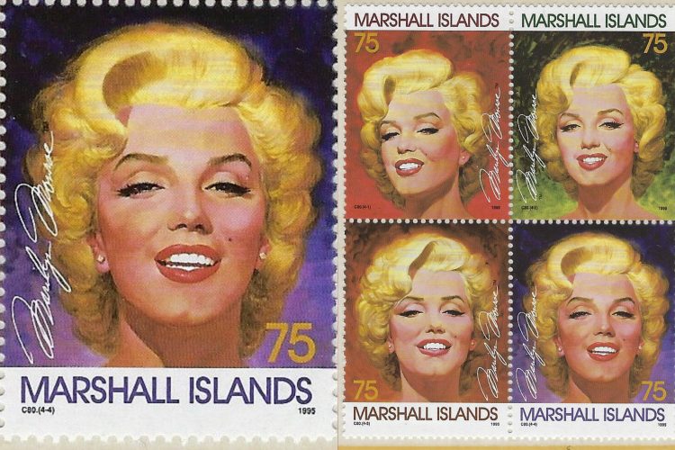 The artwork is based on a series of postage stamps issued in the Marshall Islands (located between Hawaii and the Philippines) in 1995, seemingly inspired by classic glamour shots of Marilyn circa 1952. Even in our current era of instant communication via email, text and social media, Monroe-themed stamps remain popular worldwide with fans and collectors – especially in Africa.