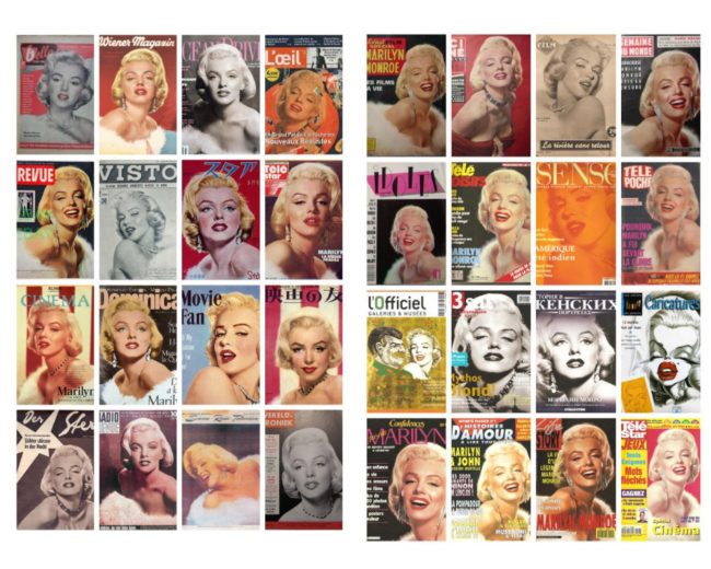 While Marilyn’s shoulders are usually bared, it’s her hair and face, and not her body’s curves, which are highlighted here – marking the final stage of her ascent from pin-up girl to glamour queen. And as a reminder of their cultural ubiquity, here’s a selection of magazine covers featuring these images published over the last seventy years.