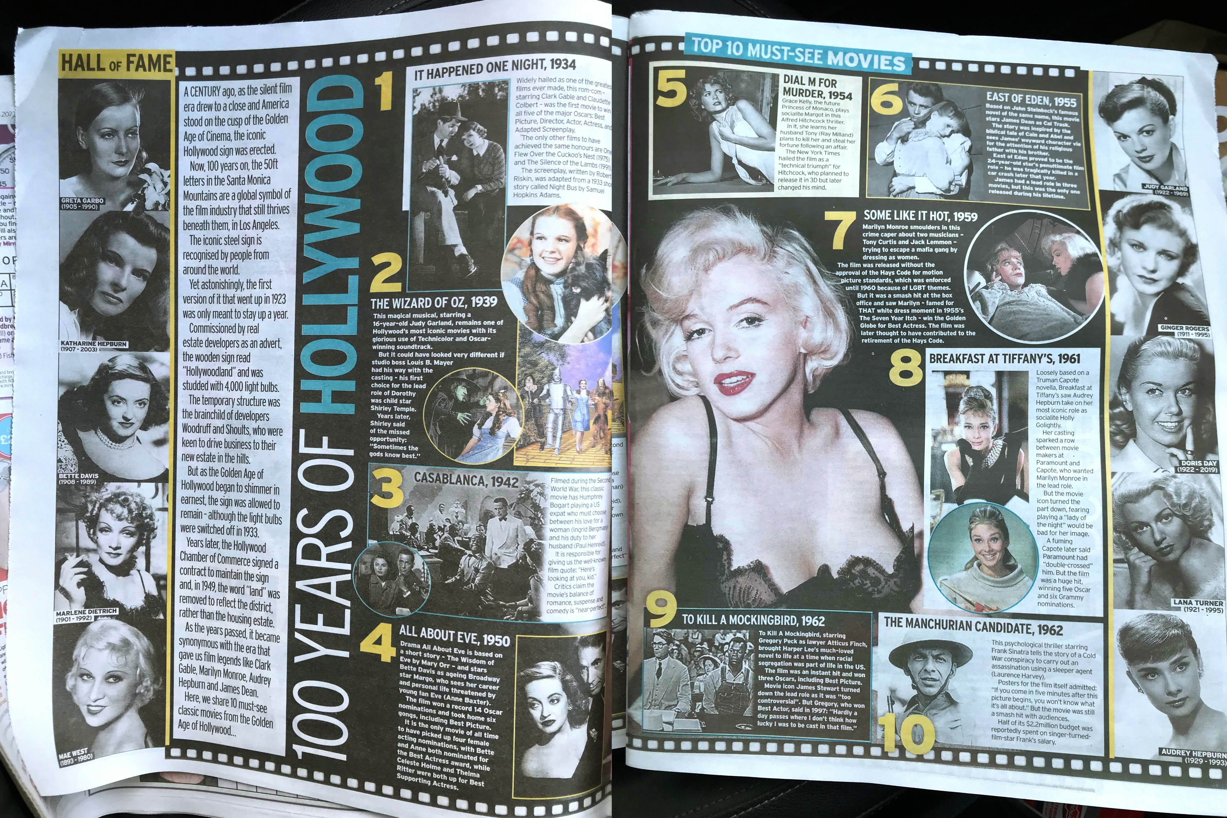UK fans, take note: today’s Sunday Mirror includes a supplement celebrating 100 Years of Hollywood. Marilyn graces the cover (in a publicity still for Gentlemen Prefer Blondes), while inside, she appears twice in a list of Top 10 Must-See Movies: All About Eve is ranked fourth, with Some Like It Hot following in seventh place.
