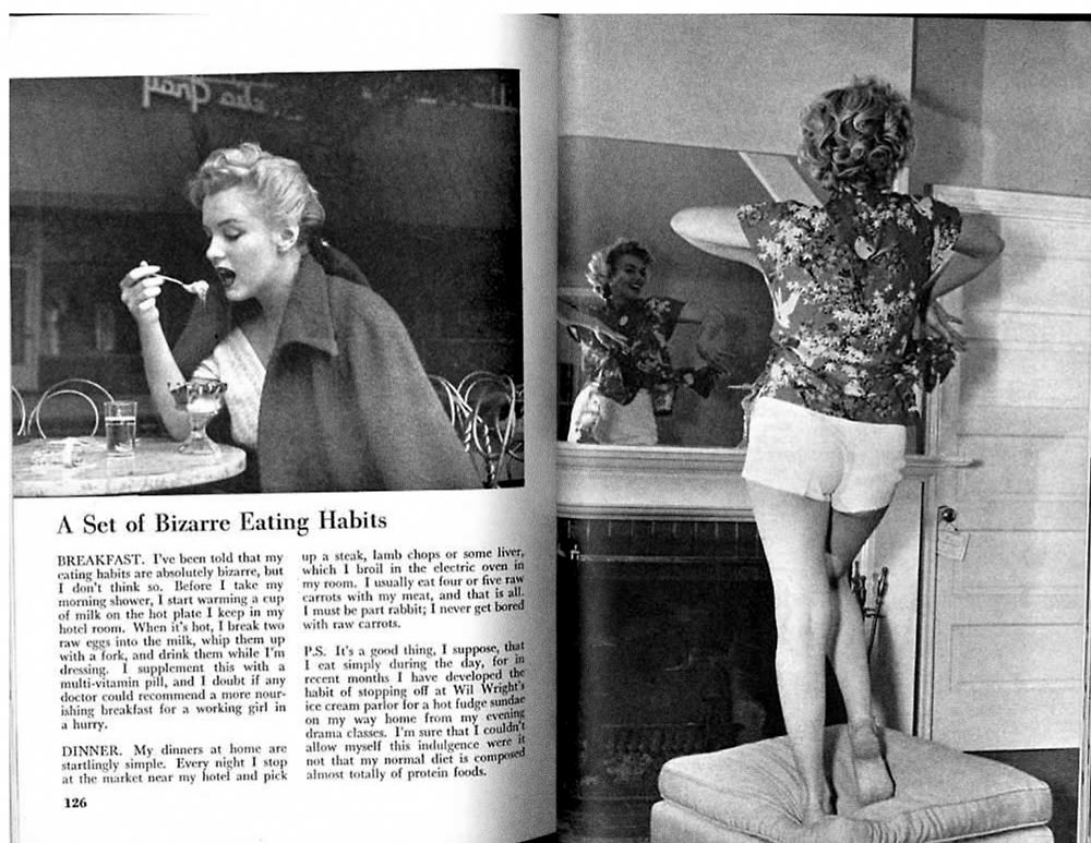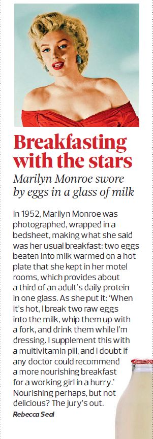 Marilyn is also featured in today’s magazine supplement for The Observer, as part of a cover story, ‘Breakfasting With the Stars.’ Her rather spartan morning meal of eggs in milk was first revealed in a 1952 article for Pageant magazine, ‘How I Stay in Shape.’ As Rebecca Seal comments: “Nourishing perhaps, but not especially delicious, which is why it’s nicer with a little added sugar, nutmeg and vanilla.”