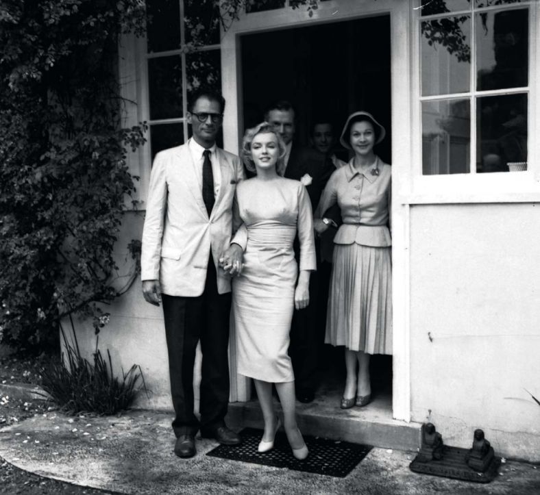 Marilyn arrived in the UK on July 14th, 1956 – 67 years ago this week – to film The Prince and the Showgirl with Sir Laurence Olivier. She was accompanied by Arthur Miller, whom she had married just two weeks earlier; and they posed for the press alongside Olivier and his wife Vivien Leigh outside Parkside House in Englefield Green, Surrey, which would be home to the Millers for the next four months. (A definitive account of Marilyn’s time in England can be found in Michelle Morgan’s book, When Marilyn Met the Queen.)