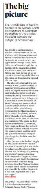 That fun was in fairly short supply on The Misfits, however. The film was shot in the 40C-plus heat of the Nevada desert. The director, John Huston, was drinking and gambling, and Monroe’s prescription drug addiction saw her frequently absent from the set and finally hospitalised for two weeks. ‘She was being atrocious to Arthur [Miller],’ Arnold told me. ‘It began in the heat of the summer and ended in the cold of the desert. It was not a happy set, and it got less happy.'”