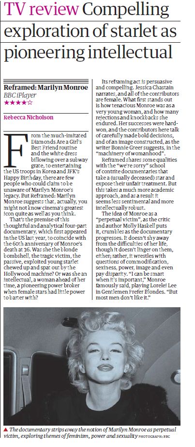 “At times, Reframed is overzealous with the cheer-leading revisionism. Towards the end, even Monroe singing Happy Birthday at Madison Square Garden to President John F Kennedy is presented as a shrewd power move – when it always seemed the point at which her jittery, over-medicated fragility entered a full-on collision course with tragedy. Will those posthumous Marilyn Inc cash registers ever cease ringing? Maybe not, but at least, here, you get the sense of women going out to bat for her.” – Barbara Ellen, The Observer