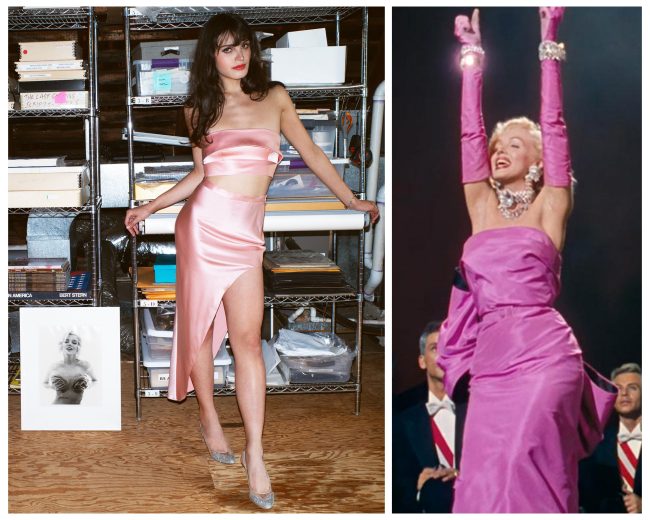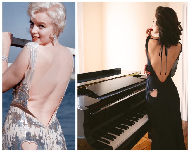 ‘The cutout dress was really inspired by the dress Marilyn wore in Some Like It Hot. I never really looked at the details, which were quite risqué, especially for the times,’ shares Zuccarini. ‘There was a real cutout on the backside of Marilyn’s dress, sheer cups with a beading detail that looked like pasties, and a heart-shaped cutout on the butt. When we started doing the research, I didn’t notice these details from watching the movie. Rather, I caught them while looking at the still photography.'”