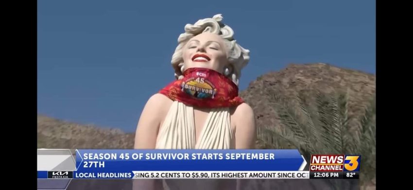 “CBS is putting Survivor buffs, the stretchy bandanas the players wear, on landmarks around the country, including a Marilyn Monroe statue in Palm Springs and the Miles the Monster monument in Dover, Delaware.