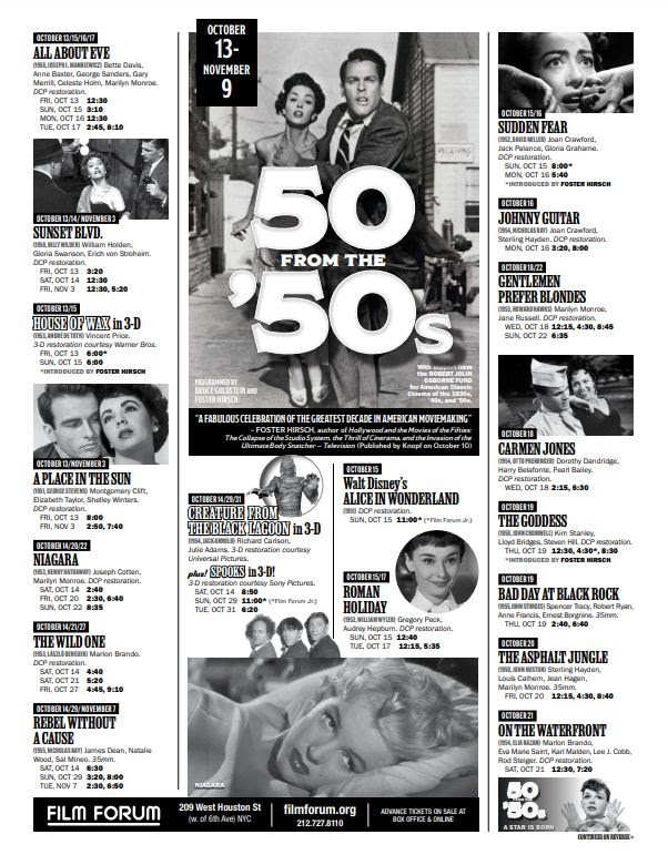 Four of Marilyn’s finest movies are featured in 50 From the 50s, a new program at Film Forum NYC. Starting on Friday with All About Eve, this retrospective marks the publication of Foster Hirsch’s Hollywood and the Movies of the Fifties. Among the other films showing this month is The Goddess (1957), a portrait of a troubled star based on Marilyn; and Carroll Baker will be the guest of honor at a screening of Baby Doll (1956.)