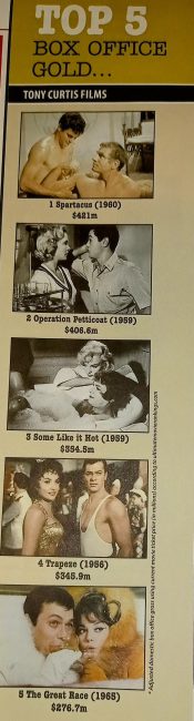 Some Like It Hot (1959) comes third in a ranking of Tony Curtis’ Top 5 Box-Office Gold movies, right behind two other films from the same period; Operation Petticoat (1959) – alongside Cary Grant, whom Curtis had parodied in Some Like It Hot – and Spartacus (1960.) Some Like It Hot was Marilyn’s highest-grossing film, followed by another Billy Wilder picture, The Seven Year Itch (1955).