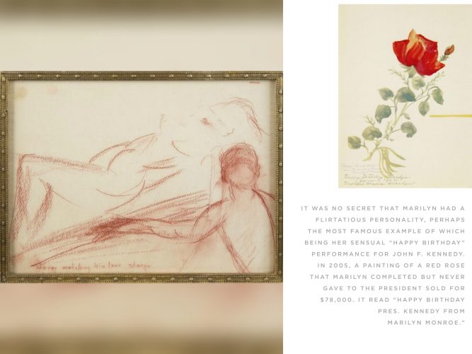 The painting’s traditional style bears little resemblance to her usual, more abstract watercolours, and the inscription to JFK is written below a previous dedication to Marilyn – which suggests the picture was merely a gift to her that was subsequently altered. Nonetheless, the rose painting was sold for $78,000 at Julien’s Auctions in 2005.