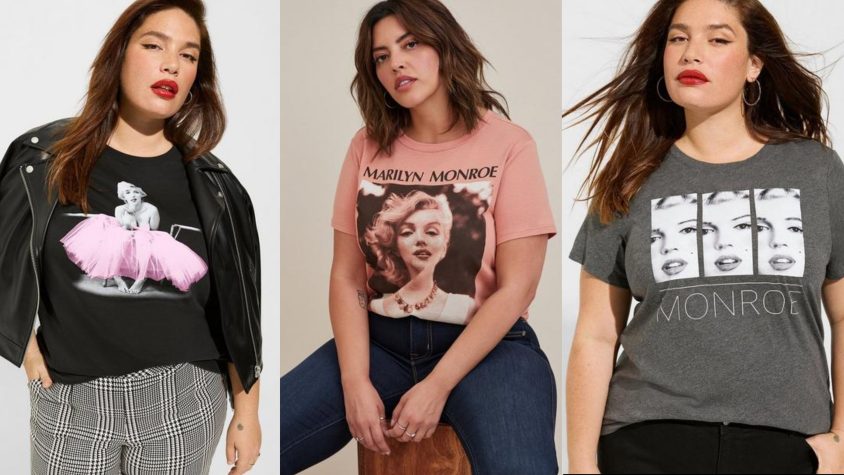 There’s also a retro-style, button-front swing dress or roll-sleeve tee with Marilyn-inspired prints…